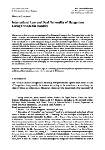 Ganczer, Mónika (2012) International law and dual nationality of Hungarians living outside the borders. Acta Juridica Hungarica, 53 (4). pp. 316-333. ISSN 1216-2574