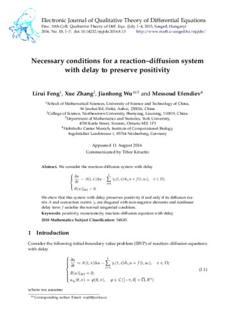 Feng, Lirui and Zhang, Xue and Wu, Jianhong and Efendiev, Messoud (2016) Necessary conditions for reaction-diffusion system with delay preserving positivity. Electronic Journal of Qualitative Theory of Differential Equations, 2016 (13). pp. 1-7. ISSN 1417-3875
