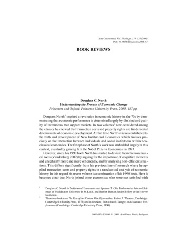(1)Douglass C. North: Understanding the Process of Economic Change (Princeton and Oxford: Princeton University Press, 2005, 187 pp. - Reviewed by Judit Kapás), (2) Vladimir Mau: From Crisis to Growth (London: Centre for Research into Post-Communist Economies, New series, No. 21, 2005, 305 pp. - Reviewed by László Csaba), (3) Imre Ferto: Agri-food Trade between Hungary and the EU (Budapest: Századvég, 2004, 257 pp. - Reviewed by Sándor Mészáros)