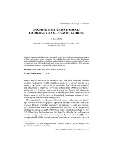 Gábor, István R. (2005) Unionised Firm versus Producer Co-operative: A Scholastic Exercise. Acta Oeconomica, 55 (3). pp. 271-286. ISSN 0001-6373