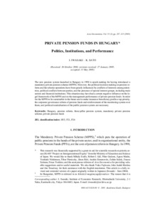 Iwasaki, Ichiro and Sato, Kazuko (2005) Private Pension Funds in Hungary. Politics, Institutions, and Performance. Acta Oeconomica, 55 (3). pp. 287-315. ISSN 0001-6373