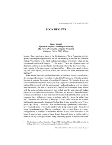 Book Reviews: (1) János Kornai: A gondolat erejével: Rendhagyó önéletrajz(By Force of Thought: Irregular Memoirs). Budapest: Osiris, 2005, 426 pp. (Reviewed by Katalin Szabó); (2) William J. Baumol: The Free Market Innovation Machine - Analyzing the Growth Miracle of Capitalism. Princeton University Press, 2002, 318 pp. (Reviewed by Jan Kettnaker)