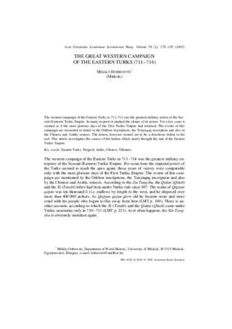 Dobrovits, Mihály (2005) The Great Western Campaign of the Eastern Turks (711-714). Acta Orientalia, 58 (2). pp. 179-185. ISSN 0001-6446
