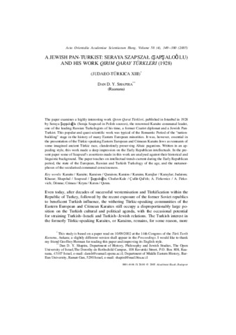 Shapira, Dan D. Y. (2005) A Jewish Pan-Turkist: Seraya Szapszal (Sapsaloglu) and his Work Qirim Qaray Türkleri (1928). Acta Orientalia, 58 (4). pp. 349-380. ISSN 0001-6446