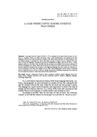 Hasznos, Andrea (2006) A Case Where Coptic is more Syndetic than Greek. Acta Antiqua, 46 (1-2). pp. 91-97. ISSN 0044-5975