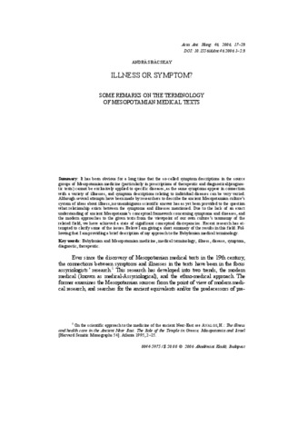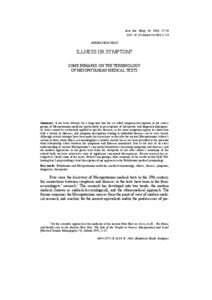 It has been obvious for a long time that the so-called symptom descriptions in the source groups of Mesopotamian medicine (particularly in prescriptions of therapeutic and diagnostical/prognostic texts) cannot be exclusively applied to specific diseases, as the same symptoms appear in connection with a variety of illnesses, and symptom descriptions relating to individual diseases can be very varied. Although several attempts have been made by researchers to describe the ancient Mesopotamian culture's system of ideas about illness, no unambiguous scientific answer has as yet been provided to the question what relationship exists between the symptoms and illnesses mentioned. Due to the lack of an exact understanding of ancient Mesopotamia's conceptual framework concerning symptoms and diseases, and the modern approaches to the given texts from the viewpoint of our own culture's taxonomy of the related field, we have achieved a state of significant conceptual discrepancies. Recent research has attempted to clarify some of the issues. Below I am giving a short summary of the results in this field. Following that I am providing a brief description of my approach to the Babylonian medical terminology.