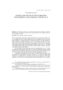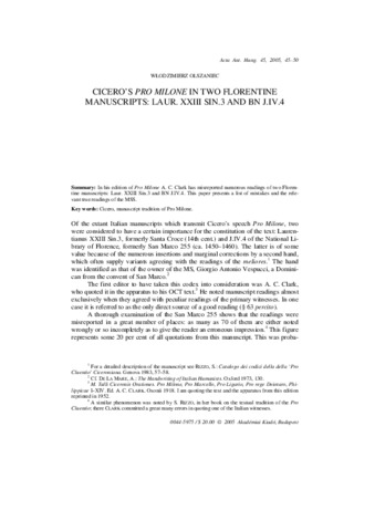 Olszaniec, Włodzimierz (2005) Cicero's Pro Milone in Two Florentine Manuscripts: Laur. XXIII Sin.3 and BN J.IV.4. Acta Antiqua, 45 (1). pp. 45-50. ISSN 0044-5975
