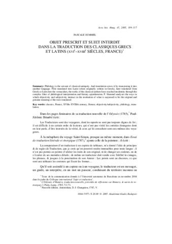 Hummel, Pascale (2005) Objet prescrit et sujet interdit dans la traduction des classiques Grecs et Latins (XVIe-XVIIIe siècles, France). Acta Antiqua, 45 (1). pp. 109-117. ISSN 0044-5975