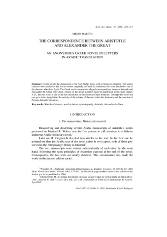 Maróth, Miklós (2005) The Correspondence between Aristotle and Alexander the Great. An Anonymous Greek Novel in Letters in Arabic Translation. Acta Antiqua, 45 (2-3). pp. 231-315. ISSN 0044-5975
