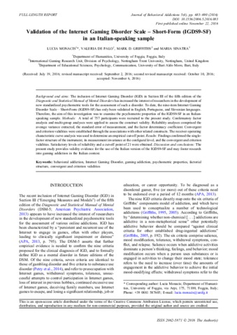Monacis, Lucia and Palo, Valeria de and Griffiths, Mark D. and Sinatra, Maria (2016) Validation of the Internet Gaming Disorder Scale – Short-Form (IGDS9-SF) in an Italian-speaking sample. Journal of Behavioral Addictions, 5 (4). pp. 683-690. ISSN 2062-5871