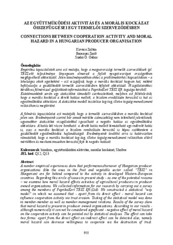Empirikus tapasztalatok sora azt mutatja, hogy a magyarországi termelői szerveződése k (pl. TÉSZ - ek) teljesítménye lényegesen elmarad a fejlett nyugat - európai országokban megfigyelhető aktivitástól. Jelen tanulmányunkban ehhez a problémakörhöz kapcsolódóan – a lehetséges okok egyikeként – azt vizsgáljuk, hogy a morális kockázat hogyan hat, miként befolyásolja a gazdálkodók termelői szerveződésben kifejtett aktivitását. Vizsg álatainkhoz kérdőíves felméréssel gyűjtöttünk információkat a PaprikaKert TÉSZ Kft. tagsága köréből. Kutatómunkánk során egy statisztikai útmodellt szerkesztettünk, melyben azt feltételeztük, hogy a morális kockázat a direkt hatása mellett, a bizalom erodálásán keresztül is hat az együttműködési aktvitásra. A statisztikai modell tesztelése tag - tag, illetve tagság -menedzsment relációban is megtörtént. A felmérés tapasztalatai azt mutatják, hogy a termelői szerveződésben a morális kocká zat jelen van. Eredményeink szerint bár annak mértéke számszakilag nem tekinthető jelentős nek, ugyanakkor statisztikai vizsgálatokkal igazolható a negatív hatása az együttműködési aktivitásra. A hatás két részre bontható: a direkt hatás mellett kimutatható egy indirekt hatás is, azaz a morális kockázat a bizalom rombolásán keresztül is képes csökke nteni a gazdálkodók együttműködési hajlandóságát. Eredményeink továbbá arra is határozottan rámutattak, hogy a morális kockázat tag - tag, illetve tagság - menedzsment relációban eltérő mértékben és mechanizmusokon keresztül fejti ki negatív hatását.
