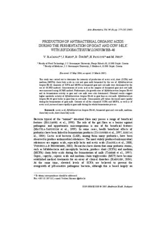 Slačanac, V. and Hardi, J. and Čuržik, D. and Pavlović, H. and Jukić, M. (2005) Production of antibacterial organic acids during the fermentation of goat and cow milk with Bifidobacterium longum BB-46. Acta Alimentaria, 34 (3). pp. 277-285. ISSN 0139-3006