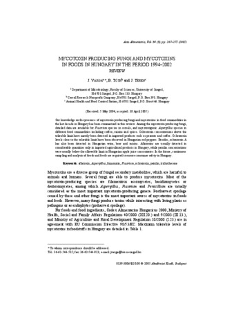 Varga, J. and Tóth, B. and Téren, J. (2005) Mycotoxin producing fungi and mycotoxins in foods in Hungary in the period 1994-2002. Acta Alimentaria, 34 (3). pp. 267-275. ISSN 0139-3006