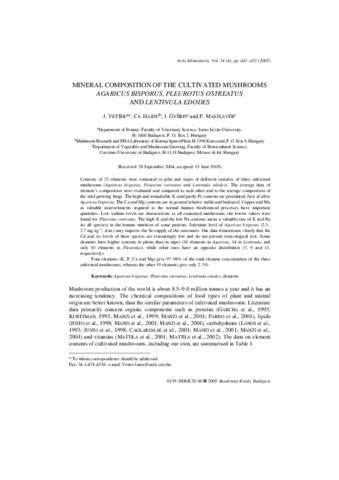 Vetter, J. and Hajdú, Cs. and Gyorfi, J. and Maszlavér, P. (2005) Mineral composition of the cultivated mushrooms Agaricus bisporus, Pleurotus ostreatus and Lentinula edodes. Acta Alimentaria, 34 (4). pp. 441-451. ISSN 0139-3006
