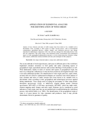 Suhaj, M. and Korenovská, M. (2005) Application of elemental analysis for identification of wine origin. A review. Acta Alimentaria, 34 (4). pp. 393-401. ISSN 0139-3006