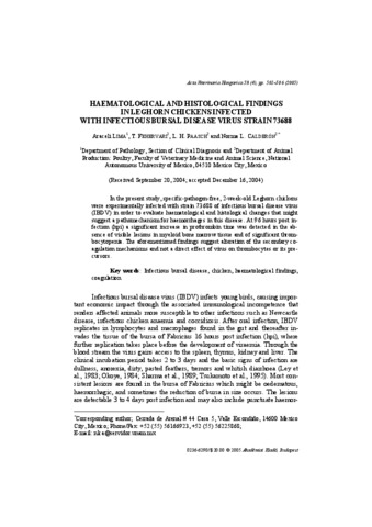 Lima, Araceli and Fehervari, T. and Paasch, L. H. and Calderón, Norma L. (2005) Haematological and histological findings in Leghorn chickens infected with infectious bursal disease virus strain 73668. Acta Veterinaria Hungarica, 53 (4). pp. 501-506. ISSN 0236-6290