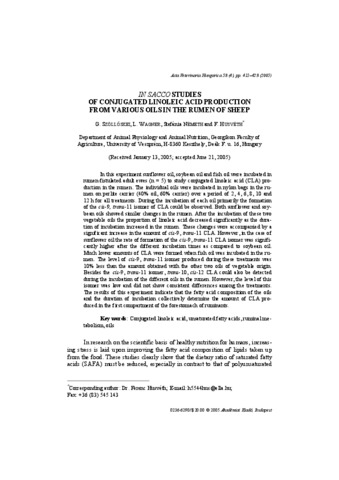 Szöllőskei, G. and Wagner, L. and Németh, Stefánia and Husvéth, F. (2005) In sacco studies of conjugated linoleic acid production from various oils in the rumen of sheep. Acta Veterinaria Hungarica, 53 (4). pp. 411-423. ISSN 0236-6290