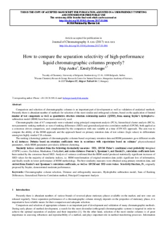 Andric, Filip and Héberger, Károly (2017) How to compare separation selectivity of high-performance liquid chromatographic columns properly? JOURNAL OF CHROMATOGRAPHY A, 1488. pp. 45-56. ISSN 0021-9673