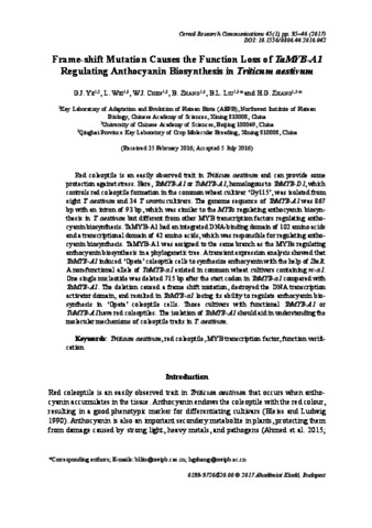 Ye, G.J. and Wei, L. and Chen, W.J. and Zhang, B. and Liu, B.L. and Zhang, H.G. (2017) Frame-shift mutation causes the function loss of TaMYB-A1 regulating anthocyanin biosynthesis in Triticum aestivum. Cereal Research Communications, 45 (1). pp. 35-46. ISSN 0133-3720