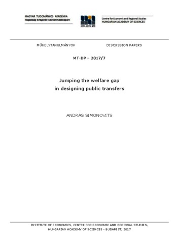 Simonovits, András (2017) Jumping the welfare gap in designing public transfers = A társadalmi transzferek tervezése és a jóléti szakadék ugrása. Műhelytanulmányok = Discussion Papers (MT-DP- 2017/7) . Institute of Economics, Centre for Economic and Regional Studies, Hungarian Academy of Sciences, Budapest. ISBN 978-615-5594-89-2