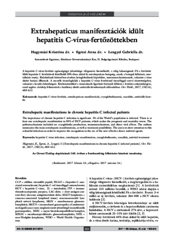 Hagymási, Krisztina and Egresi, Anna and Lengyel, Gabriella (2017) Extrahepaticus manifesztációk idült hepatitis C-vírus-fertőzöttekben | Extrahepatic manifestations in chronic hepatitis C infected patients. Orvosi Hetilap, 158 (16). pp. 603-611. ISSN 0030-6002
