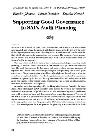 Jakovác, Katalin and Domokos, László and Németh, Erzsébet (2017) Supporting Good Governance in SAI’s Audit Planning. POLGÁRI SZEMLE: GAZDASÁGI ÉS TÁRSADALMI FOLYÓIRAT, 13 (Spec.). pp. 64-82. ISSN 1786-6553
