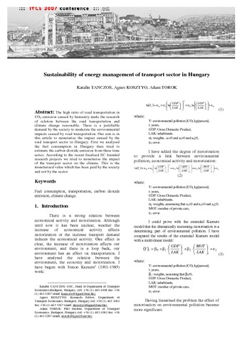 Török, Ádám and Tánczos, Lászlóné and Kosztyó, Ágnes (2007) Sustainability of energy management of transport sector in Hungary. In: IYCE 2007. International Youth Conference on Energetics. BME, Budapest, pp. 203-207. ISBN 978-693-420-908-0