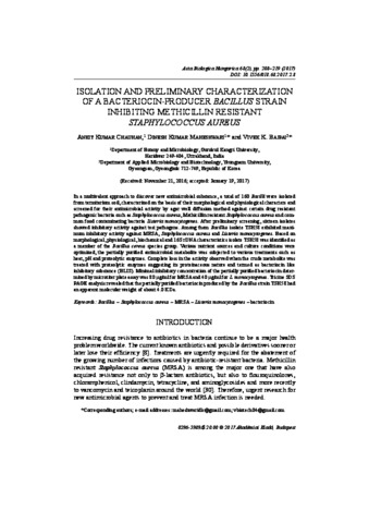 Chauhan, Ankit Kumar and Maheshwari, Dinesh Kumar and Bajpai, Vivek K. (2017) Isolation and preliminary characterization of a bacteriocin-producer Bacillus strain inhibiting methicillin resistant Staphylococcus aureus. Acta Biologica Hungarica, 68 (2). pp. 208-219. ISSN 0236-5383