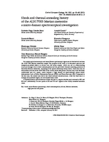 Nagy, Szabolcs and Józsa, Sándor and Gucsik, Arnold and Bérczi, Szaniszló and Ninagawa, Kiyotaka and Nishido, Hirotsugu and Veres, Miklós and Kereszturi, Ákos and Hargitai, Henrik (2012) Shock and thermal annealing history of the ALH 77005 Martian meteorite: a micro-Raman spectroscopical investigation. Central European Geology, 55 (1). pp. 33-48. ISSN 1788-2281