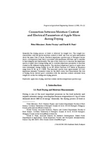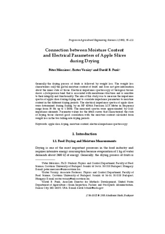 Mészáros, Péter and Vozáry, Eszter and Funk, David B. (2005) Connection between Moisture Content and Electrical Parameters of Apple Slices during Drying. Progress in Agricultural Engineering Sciences, 1 (1). pp. 95-121. ISSN 1786-335X