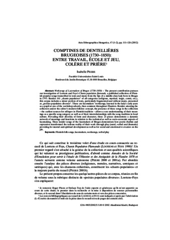 Peere, Isabelle (2002) Comptines de dentelliéres brugeoises (1730-1850): Entre travail, école et jeu, colére et priére. Acta Ethnographica Hungarica, 47 (1-2). pp. 111-126. ISSN 1216-9803