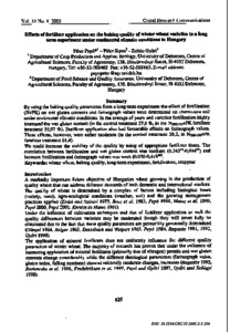 By using the baking quality parameters from a long-term experiment the effect of fertilization (N+PK) on wet gluten contents and farinograph values were determined on chernozem soil under continental climatic conditions. In the average of years and varieties fertilization highly increased the wet gluten content (in the control treatment 27,6 %, in the N <sub>300/150</sub> +PK fertilizer treatment 35,97 %). Fertilizer application also had favourable effects on farinograph values. These effects, however, were rather moderate (in the control treatment 56,2, in N <sub>300/150</sub> +PK fertilizer treatment 61,4).We could increase the stability of the quality by using of appropriate fertilizer doses. The correlation between fertilization and wet gluten content was medium (0.343 <sup>xx</sup> –0,694 <sup>xx</sup> ) and between fertilization and farinograph values was weak (0.030–0.419 <sup>xx</sup> ).