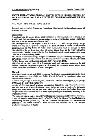 Filep, Tibor and Rékási, Márk and Morvai, Balázs (2006) Water extractable organic matter (WEOM) concentration of four different soils as affected by communal sewage sludge loads. Cereal Research Communications, 34 (1). pp. 167-170. ISSN 0133-3720