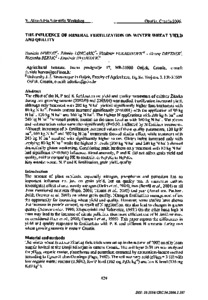 The effect of the N, P and K fertilisation on yield and quality parameters of cultivar Žitarka during two growing seasons (2002/03 and 2003/04) was studied. Fertilization increased yield, although only treatment with 200 kg N ha <sup>−1</sup> yielded significantly higher than treatments with 80 kg N ha <sup>−1</sup> . Protein content increased significantly (P<0.001) with the application of 80 kg N ha <sup>−1</sup> , 120 kg N ha <sup>−1</sup> and 160 kg N ha <sup>−1</sup> . The highest N applications with 200 kg N ha <sup>−1</sup> and 240 kg N ha <sup>−1</sup> increased protein content on the same level as with 160 kg N ha <sup>−1</sup> . Wet gluten and sedimentation value were also significantly (P<0.001) affected by N fertilizer treatments. Although increment of N fertilization increased values of these quality parameters, 120 kg N ha <sup>−1</sup> , 160 kg N ha <sup>−1</sup> and 200 kg N ha <sup>−1</sup> treatments showed similar effect, while treatment with 240 kg N ha <sup>−1</sup> resulted with significantly higher values. Gluten index increased only with applying 80 kg N ha <sup>−1</sup> while the highest N levels (200 kg N ha <sup>−1</sup> and 240 kg N ha <sup>−1</sup> ) showed dramatically gluten weakening. Considering grain hardness only treatment with 80 kg N ha <sup>−1</sup> had significant (P<0.001) influence. Simultaneously, P and K did not affect grain yield and quality, neither comparing PK to controle, or N <sub>2</sub> P <sub>1</sub> K <sub>1</sub> to N <sub>2</sub> P <sub>2</sub> K <sub>2</sub> .