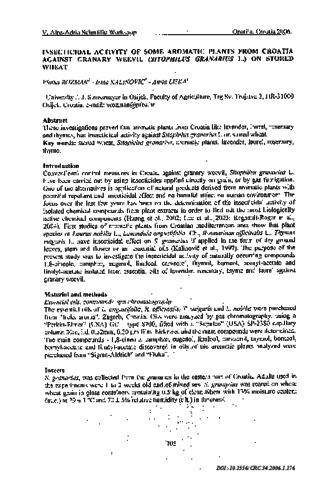 These investigations proved that aromatic plants from Croatia like lavander, laurel, rosemary and thymus, had insecticidal activity against Sitophilus granarius L on stored wheat.