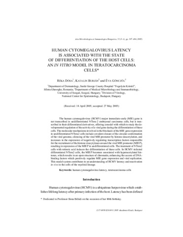 Dósa, Réka and Burián, Katalin and Gönczöl, Éva (2005) Human Cytomegalovirus Latency is Associated with the State of Differentiation of the Host Cells: an in vitro Model in Teratocarcinoma Cells. Acta Microbiologica et Immunologica Hungarica, 52 (3-4). pp. 397-406. ISSN 1217-8950