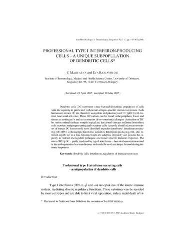 Magyarics, Z. and Rajnavölgyi, Éva (2005) Professional type I Interferon-producing cells - A Unique Subpopulation of Dendritic Cells. Acta Microbiologica et Immunologica Hungarica, 52 (3-4). pp. 443-462. ISSN 1217-8950