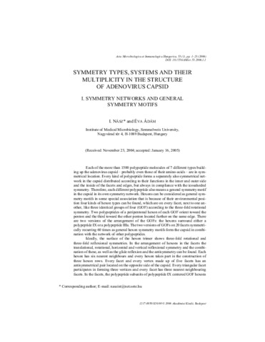 Nász, István and Ádám, Éva (2006) Symmetry Types, Systems and Their Multiplicity in the Structure of Adenovirus Capsid. Acta Microbiologica et Immunologica Hungarica, 53 (1). pp. 1-23. ISSN 1217-8950