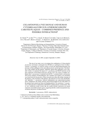 Virok, D. and Kis, Z. and Kari, L. and Barzo, P. and Sipka, R. and Burian, Katalin and Nelson, D. E. and Jackel, Marta and Kerenyi, T. and Bodosi, M. and Gönczöl, Eva and Endresz, Valeria (2006) Chlamydophila pneumoniae and Human Cytomegalovirus in Atherosclerotic Carotid Plaques - Combined Presence and Possible Interactions. Acta Microbiologica et Immunologica Hungarica, 53 (1). pp. 35-50. ISSN 1217-8950
