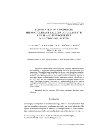 Kanwar, S. S. and Kaushal, R. K. and Sultana, H. and Chimni, S. S. (2006) Purification of a Moderate Thermotolerant Bacillus coagulans BTS1 Lipase and its Properties in a Hydro-gel System. Acta Microbiologica et Immunologica Hungarica, 53 (1). pp. 77-87. ISSN 1217-8950