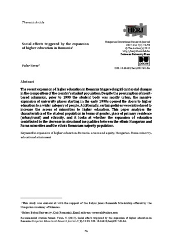 Veres, Valér (2017) Social effects triggered by the expansion of higher education in Romania. Hungarian Educational Research Journal, 7 (1). pp. 36-91. ISSN 2064-2199