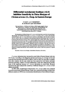 Nagy, P. and Thompson, A. R. and Schultz, M. and Solymosi, P. (2005) Differential Acetolactate Synthase (ALS) Inhibitor Sensitivity in Three Biotypes of Cirsium arvense (L.) Scop. in Eastern Europe. Acta Phytopathologica et Entomologica Hungarica, 40 (1-2). pp. 67-78. ISSN 0238-1249