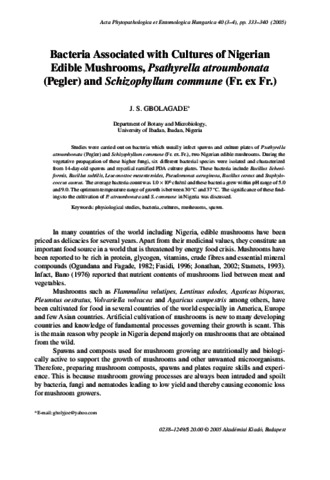 Gbolagade, J. S. (2005) Bacteria associated with cultures of Nigerian edible mushrooms, Psathyrella atroumbonata (Pegler) and Schizophyllum commune (Fr. ex Fr.). Acta Phytopathologica et Entomologica Hungarica, 40 (3-4). pp. 333-340. ISSN 0238-1249