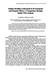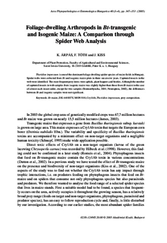Árpás, K. and Tóth, F. and Kiss, J. (2005) Foliage-dwelling arthropods in Bt-transgenic and isogenic maize: a comparison through spider web analysis. Acta Phytopathologica et Entomologica Hungarica, 40 (3-4). pp. 347-353. ISSN 0238-1249