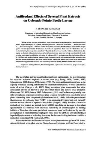 Kutas, J. and Nádasy, M. (2005) Antifeedant effects of several plant extracts on Colorado potato beetle larvae. Acta Phytopathologica et Entomologica Hungarica, 40 (3-4). pp. 355-365. ISSN 0238-1249