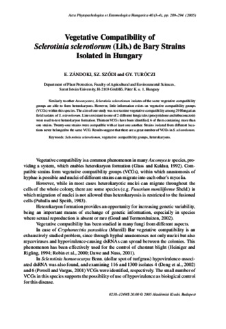 Zándoki, E. and Sződi, Sz. and Turóczi, Gy. (2005) Vegetative compatibility of Sclerotinia sclerotiorum (Lib.) de Bary strains isolated in Hungary. Acta Phytopathologica et Entomologica Hungarica, 40 (3-4). pp. 289-294. ISSN 0238-1249
