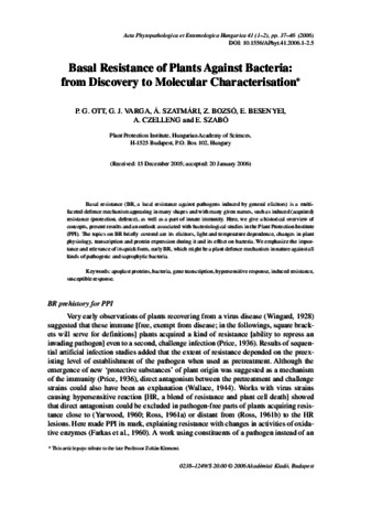Ott, P. G. and Varga, G. J. and Szatmári, Á. and Bozsó, Z. and Besenyei, E. and Czelleng, A. and Szabó, E. (2006) Basal Resistance of Plants Against Bacteria: from Discovery to Molecular Characterisation. Acta Phytopathologica et Entomologica Hungarica, 41 (1-2). pp. 37-46. ISSN 0238-1249