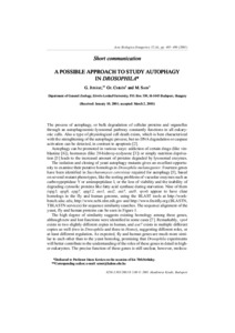 The process of autophagy, or bulk degradation of cellular proteins and organelles through an autophagosomic-lysosomal pathway constantly functions in all eukary- otic cells. Also a type of physiological cell death exists, which is best characterized with the strenghtening of the autophagic process, but no DNA degradation or caspase activation can be detected, in contrast to apoptosis [2]. Autophagy can be promoted in various ways: addiction of certain drugs (like vin- blastine [6]), hormones (like 20-hidroxy-ecdysone [3]) or simply nutrition d&epriva- tion [5] leads to the increased amount of proteins degraded by lysosomal enzymes. The isolation and cloning of yeast autophagy mutants gives an excellent opportu- nity to examine their putative homologs in Drosophila melanogaster. Fourteen genes have been identified in Saccharomyces cerevisiae required for autophagy [5], based on several mutant phenotypes, &like the sorting problems of vacuolar enzymes such as carboxypeptidase Y or aminopeptidase I, or the less of viability and the inability of degrading cytosolic proteins like fatty acid synthase during starvation. Nine of them (apg5, apg6, apg7, apg12, aut1, aut2, aut7, aut9, vps4) appear to have clear homologs in the fly and human genome, using the BLAST tools at http://work- bench.sdsc.edu, http://www.ncbi.nlm.nih.gov and http://www.fruitfly.org (BLASTN, TBLASTN services) for sequence similarity searches. The sequence alignment of the yeast, fly and human proteins can be seen in Figure 1. The high degree of similarity suggests existing homology among these genes, although new and lost functions were identified in some cases [7]. Remarkably, vps4 exists in two slightly different copies in human, and aut7 exists in multiple different copies as well (two in Drosophila and three in Homo), suggesting different roles, or at least different regulation. As expected, fly and human genes are much more simi- lar to each other than to the yeast homolog, promising that Drosophila experiments will better contribute to the understanding of the roles of these genes in detail in high- er eukaryotes. The precise function of these genes is still unclear, however, molecu-