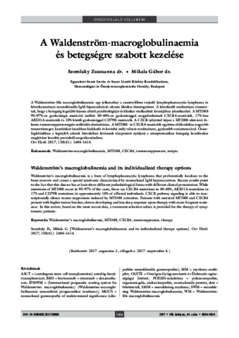 Absztrakt: A Waldenström-féle macroglobulinaemia egy jellemzően a csontvelőben terjedő lymphoplasmocytás lymphoma és következményes monoklonális IgM-hiperszekréció okozta klinikai tünetegyüttes. A közelmúlt eredményei rámutattak, hogy a betegség legalább három eltérő patobiológiájú és klinikai viselkedésű formájában jelentkezhet. A MYD88 95–97%-os gyakoriságú mutációi mellett 30–40%-os gyakorisággal megjelenhetnek CXCR4-mutációk, 17%-ban ARID1A-mutációk és 10% körüli gyakorisággal CD79B-mutációk. A CXCR-jelátvitel képes a MYD88-aktiváció fokozta tumorszuppresszorgén-működés elnémítására. A MYD88- és CXCR4-mutációk együttes előfordulása nagyobb tumortömeget, kezeléskor lassabban kialakuló és kevésbé mély választ eredményez, gyakoribb rezisztenciával. Összefoglalónkban a legújabb adatok birtokában kívánunk támpontot nyújtani a szimptomatikus betegség kezelésekor megkívánt kezelési protokoll megválasztásához. Orv Hetil. 2017; 158(41): 1604–1614. | Abstract: Waldenström’s macroglobulinaemia is a form of lymphoplasmocytic lymphoma that preferentially localizes to the bone marrow and causes a special syndrome characterized by monoclonal IgM hypersecretion. Recent results point to the fact that this disease has at least three different pathobiological forms with different clinical presentation. While mutations of MYD88 occur in 95–97% of the cases, there are CXCR4 mutations in 30–40%, ARID1A mutations in 17% and CD79B mutations in approximately 10% of afflicted individuals. CXCR pathway signaling is able to transcriptionally silence tumor suppressors induced by MYD88 activation. Patients with mutated MYD88 and CXCR4 present with higher tumor burden, slower developing and less deep response upon therapy with more frequent resistance. In this review, based on the most recent data, a treatment selection advice is provided for the therapy of symptomatic patients. Orv Hetil. 2017; 158(41): 1604–1614.