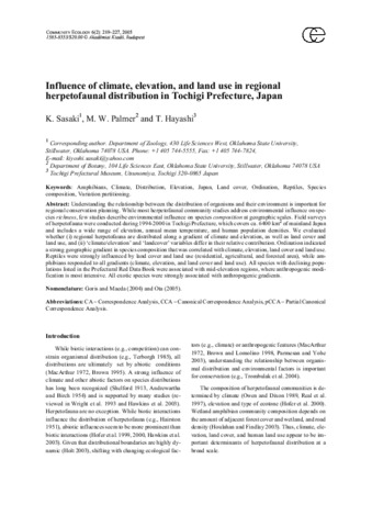 Sasaki, K. and Palmer, M.W. and Hayashi, T. (2005) Influence of climate, elevation, and land use in regional herpetofaunal distribution in Tochigi Prefecture, Japan. Community Ecology, 6 (2). pp. 219-227. ISSN 1585-8553